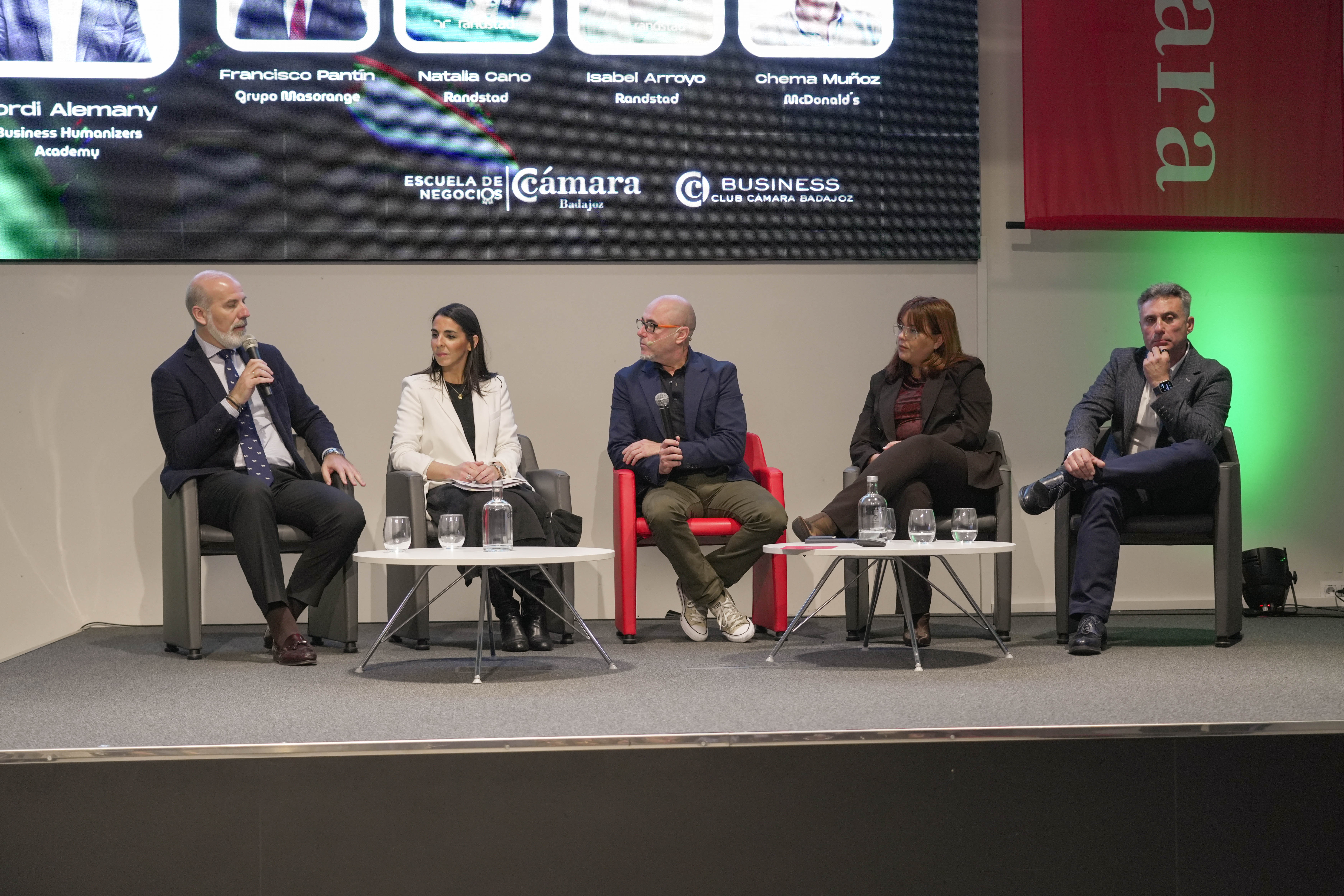 Posteriormente, la mesa redonda “Talento y cultura: el reto compartido” reunió a destacados profesionales de la región: Francisco Pantin, business manager Extremadura Grupo Masorange en SolucionesFP; Natalia Cano, directora de Randstad Extremadura; Isabel Arroyo, directora de zona de Extremadura y Andalucía Occidental en Randstad; y Chema Muñoz, Responsable de Recursos Humanos de McDonald’s de la provincia de Badajoz.
